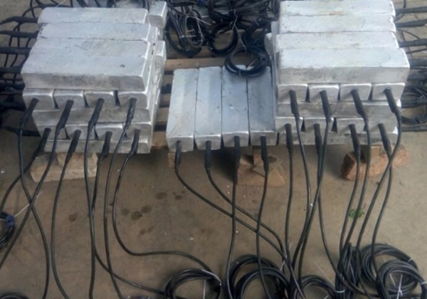 以上的鎂合金犧牲陽(yáng)極也可以經(jīng)組裝后提供給客戶。裸陽(yáng)極首先和電纜連接,連接部位 用環(huán)氧樹脂密封。然后加填充料封裝在棉布袋里。